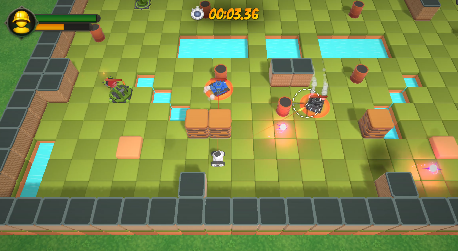 Enemy pressure is also diverse. You face kamikaze, heavy, healer+poison, minion, sniper, swarmer, and strafer units, plus multiple sentry turret variants including seeking missile and catapult types. Stages are compact and tactical (24x16 with a 1x1 player footprint), so positioning and line control are always relevant. Environment interactions add more route planning through exploding barrels, water pits, brick walls, destructible stone walls, and low walls you can shoot over but not drive through.